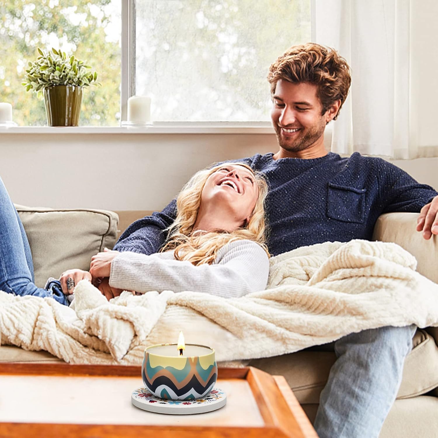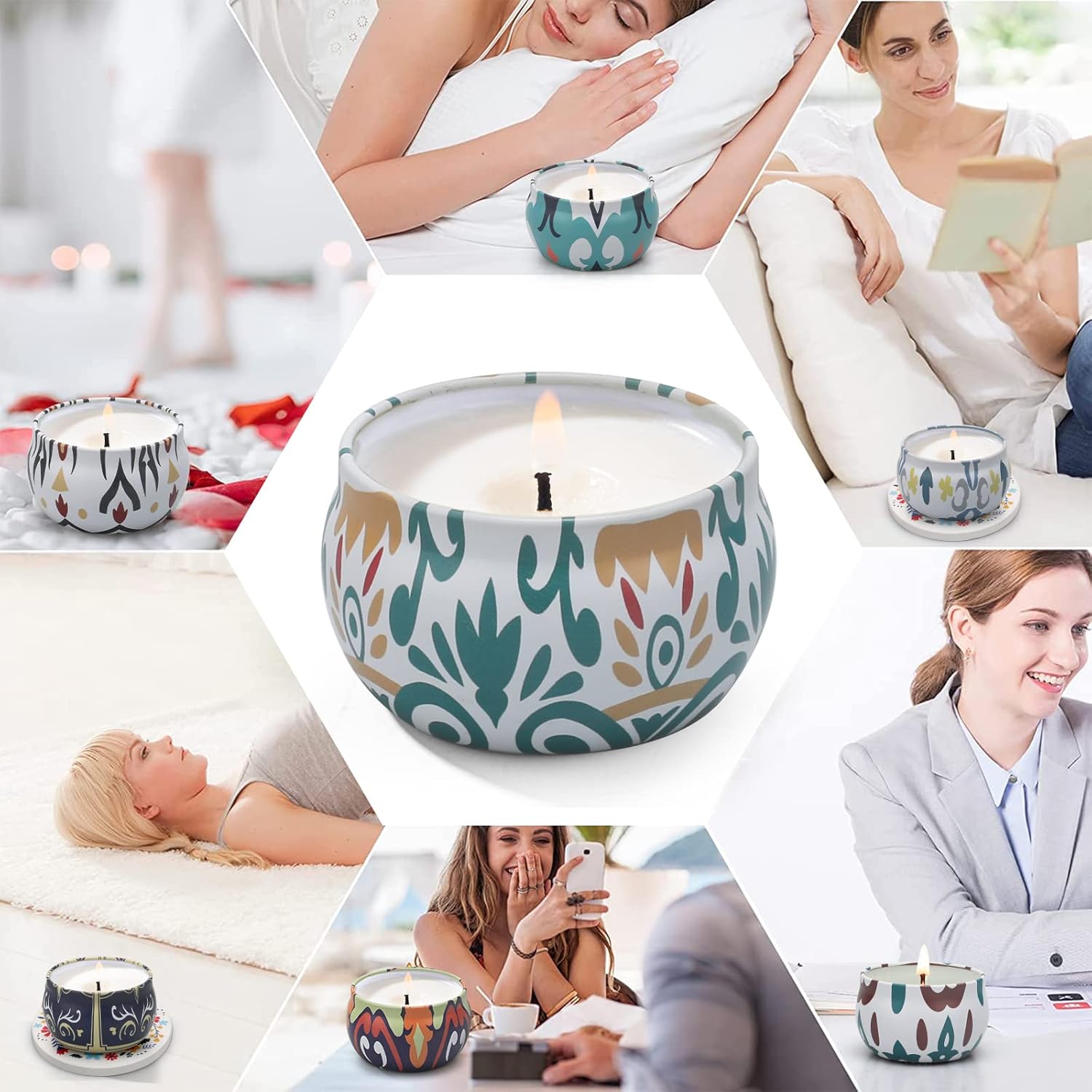 【Scented Candles for Home】Experience 12 distinct scent: Coffee, Cotton, Champagne Rose, Mahogany Teak, Fiji White Sands, Birch Vanilla, Mango Almond, Cinnamon Apple, Orange& Ginger, Cactus Flower. Each candle is housed in an artistically patterned candle tin.