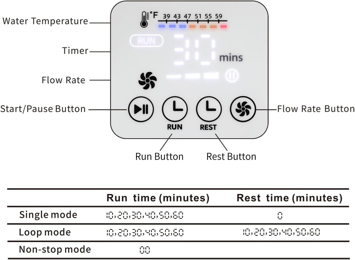 EASY USE◆ With a straightforward control panel, users can easily set the on/off times, adjust the flow rates. The water temperature thermometer with three different colors of lights allow users monitor the ice without having to scrutinize the panel or open the bucket.