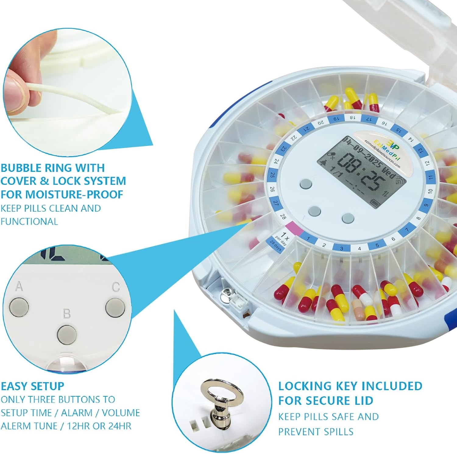 [KEY FOR LOCKING & SIMPLE SETUP, USAGE & SECURITY] Locking Cover Blocks Unauthorized Access, Integrated Mini Magnifying Glass Gives Close-Up View of Dosage Info | Plug-In, WiFi System Sets Up in Seconds with 4-hour Battery Backup for Travel & Power Outage | Secure, Lockable Cover with Manual Key to Block Unauthorized Access & Avoid Accidental Spills | Sliding Retrieval Window Provides Greater Accessibility for Seniors, Arthritis Sufferers & More.
