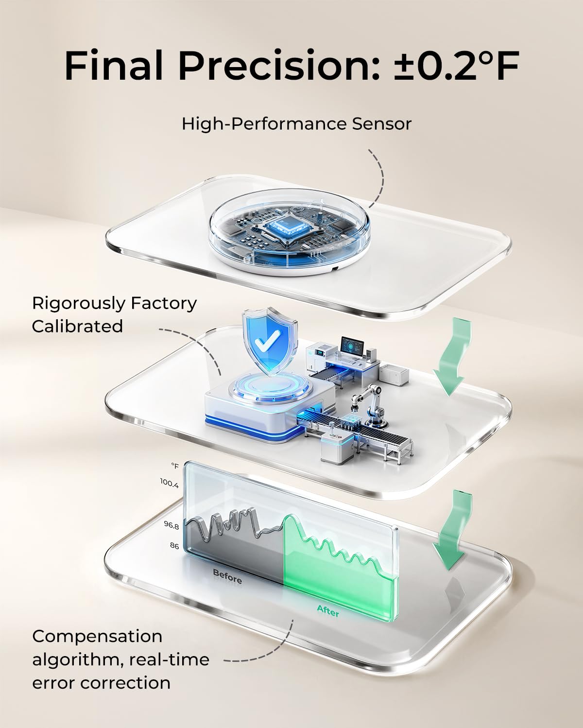 【±0.2°F High-Precision Sensor & Reliable Temperature Monitoring】 Equipped with a built-in high-performance sensor and compensation algorithm, this wearable baby thermometer delivers instant readings with ±0.1°C accuracy. By tracking temperature changes, this baby thermometer helps you precisely identify your baby’s needs—whether they require gentle care or closer attention,ensuring precise temperature monitoring and providing reliable insights for parenting decisions.
